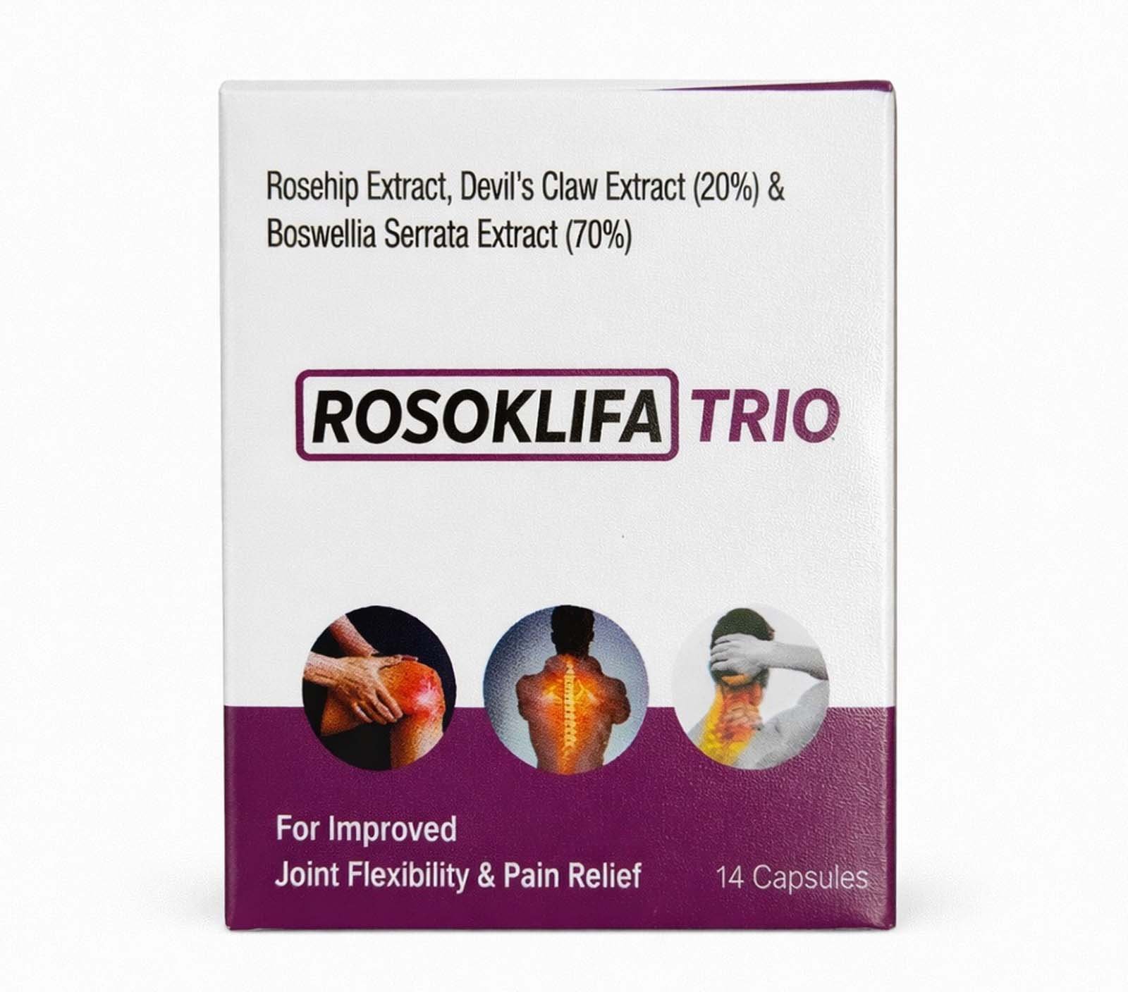 Rosoklifa Trio contains Rosehip Extract, Devil’s Claw Extract & Boswellia Serrata Extract Capsules. This formulation is developed to help support effective therapeutic management and nutritional balance depending on medical requirements.